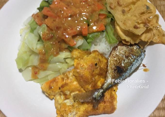 - Tata nasi di piring kemudian di samping-sampinya beri ikan goreng, telur goreng dan peyel kacang. Atas nasi beri sayuran dan siram dengan sambal kacamg..