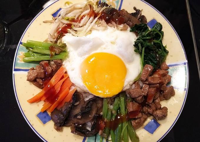 - Plating : tata nasi di mangkok / piring. Tambahkan sayuran nya. Taruh di pinggirannya ya. Tambahkan telor di tengahnya. Beri 1 sdm saus gochujang nya. Cara makannya tinggal di aduk menjadi satu..